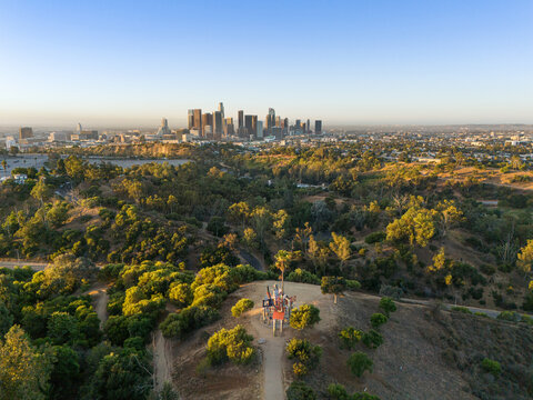 Sunrise over downtown Los Angeles, California, aerial view from Elysian Park. Clear skies.