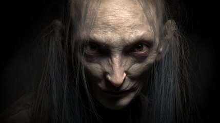 A terrifying, pale, and emaciated female figure with stringy hair and piercing eyes stares intensely in a dark