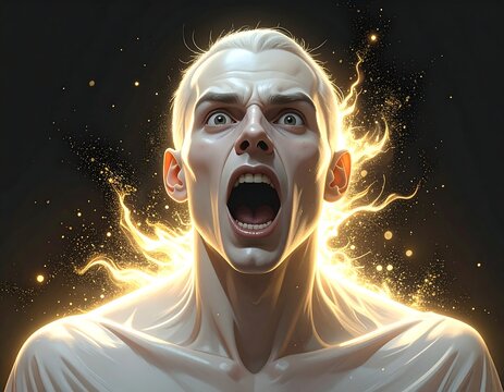 Portrait of a figure screaming with energy sparks emanating around