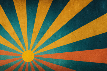 A vibrant abstract background featuring a stylized sunburst design with yellow orange and teal rays emanating from a central point on a textured surface