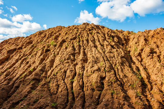 A pile of clay soil dumped by an excavator, an earth embankment against a blue sky