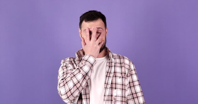 Portrait of bearded man making face palm hand gesture feeling shame and embarrassment on purple background. Emotion and people concept.