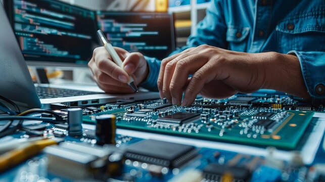 Electronic Print Circuit board PCB Design Engineers designing a PCB layout on advanced CAD software