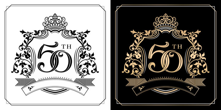 Set of anniversary logotype with gold ribbon. Golden anniversary celebration emblem design for booklet, leaflet, brochure poster, web, invitation or greeting card. Vector illustration.