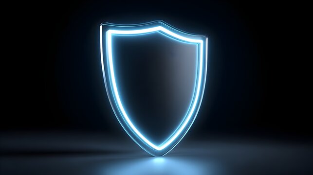 Futuristic blue neon shield emblem, security concept, protection symbol, digital safety, modern technology backdrop.