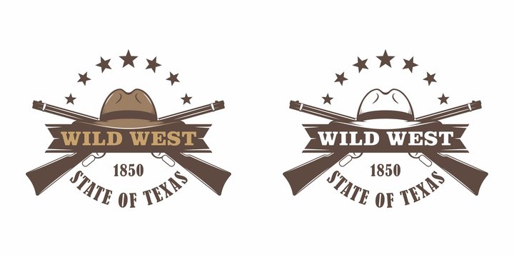 Set of color illustrations cowboy hat, crossed guns, stars, ribbon with text on a white background. Vector illustration on the theme of the wild west. American Western.