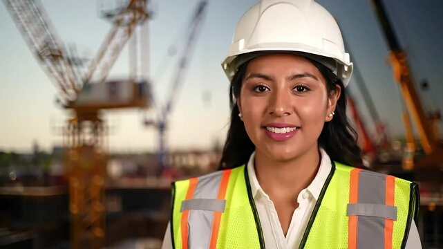 A female construction worker embodies professionalism and safety in a dynamic building site environment.