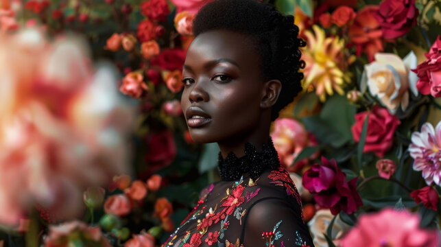 Against a backdrop of blooming flowers a black woman stands tall and elegant in a couture dress with intricate floral details. Her fierce gaze and effortless poise embody the perfect .