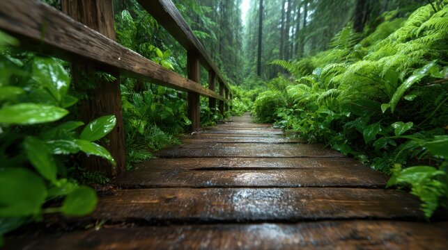 The image presents a serene wooden pathway surrounded by vibrant greenery in a tranquil forest, embodying the beauty of nature and the calm after a gentle rain.