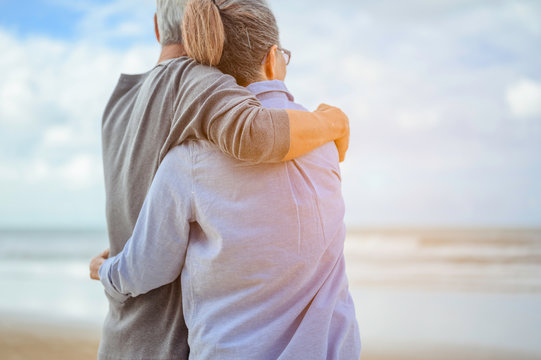 A senior couples embrace the beach in the morning, look at the bright blue skies and plan life insurance with a happy retirement concept.