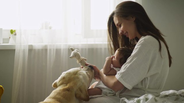 Side view woman embracing adorable two month old baby girl. Mother sitting on bed holding toy, nursing daughter and playing wit big labrador. Mother with baby in bedroom enjoying togetherness.