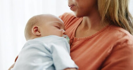Love, happy and mom holding her baby for calm, peaceful or cute sleeping in nursery at home. Smile, bonding and young mother embracing her newborn, child or kid with care in house in the morning.