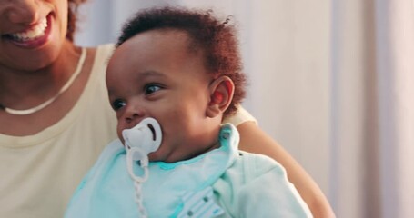 Smile, bonding and mother holding baby with pacifier for comfort with love and care at family home. Trust, embracing and closeup of mom carrying sweet boy infant, child or newborn in modern house.