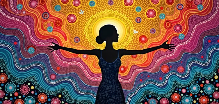 Colorful aboriginal art style woman with arms open embracing diverse cultural heritage of Australia. Image evokes sense of celebration, unity. Vivid colours, intricate dot patterns create festive