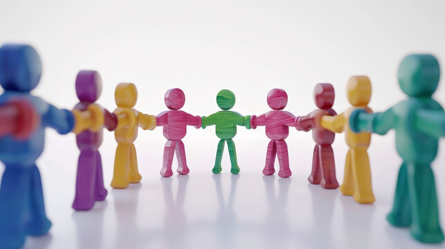 Colorful painted group of people figures representing diverse ethnicities and cultures embracing inclusion and unity in modern society