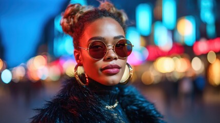 A fashionable woman wearing sunglasses at a vibrant night market, exuding confidence and style amidst colorful lights and a bustling atmosphere, embracing urban nightlife.