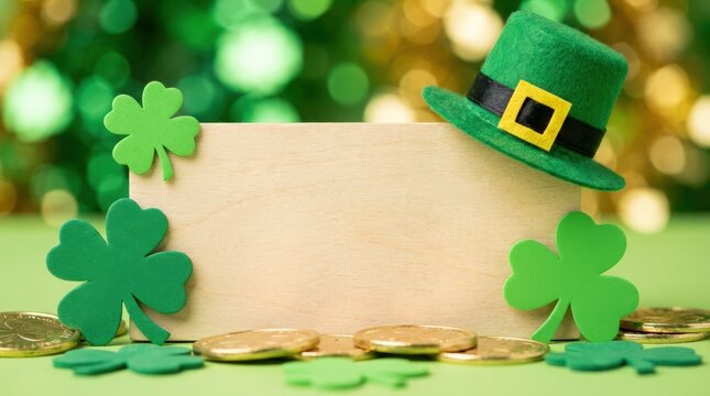 St. Patrick's day celebration festive atmosphere decorative green hat and coins playful environment close-up view embracing irish culture for seo optimization