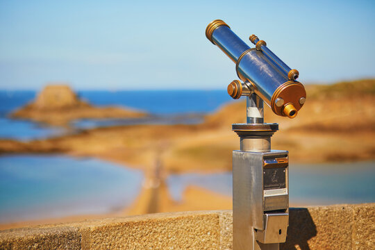 Touristic telescope on the fortress wall surrounding Saint-Malo Intra-Muros in Saint-Malo, France