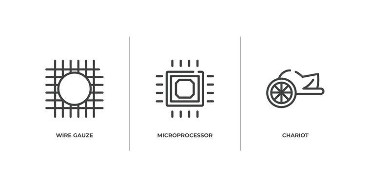 history outline icons set. thin line icons sheet included wire gauze, microprocessor, chariot vector.