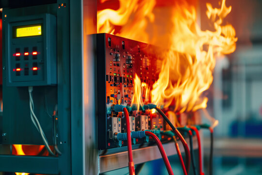 Electrical fire engulfs industrial control panels, showcasing extreme hazard and damage with