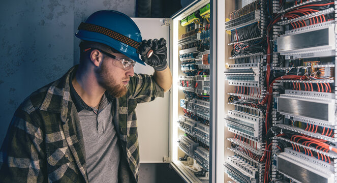 A male electrician works in a switchboard in overalls against the backdrop of emergency lighting.