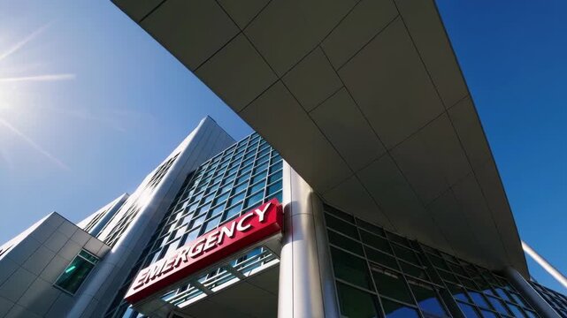 Ambulance is parked outside a modern hospital building, ready to transport patients and provide emergency medical care