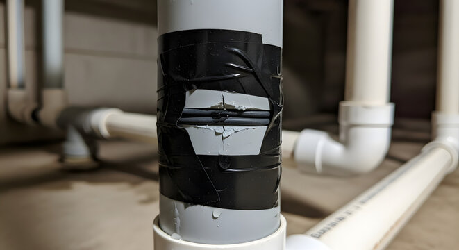 A leaky pipe drips onto the floor, creating puddles. This image highlights the urgency of repairing plumbing issues to prevent water damage and potential structural problems. Act now to avoid