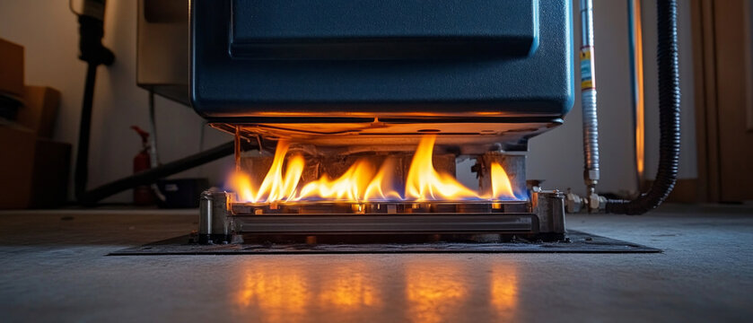 An open flame under gas equipment signals a leak hazard — a visual backdrop for safety and emergency prevention instructions.