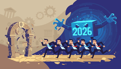 A group of businessmen in suits are running away in fear from a giant, menacing robot labeled '2026' that is emerging from a digital wave, symbolizing the overwhelming threat of future technology and