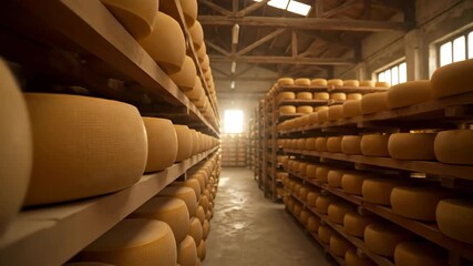 Cheese Wheels Age on Wooden Shelves in a Brightly Lit Aging Warehouse, Inside a Cheese Factory in Emilia Romagna, Italy