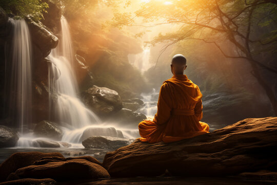 A traditional clothed religious monk is visualize with a concentrated floating in the air in the midst of a forest with  waterfall a spiritual place at sunset