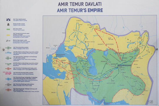 Samarkand, Uzbekistan - May 28, 2025: A map showing the borders of the Timurid empire at Timur's tomb. Borders of the Timurid state.
