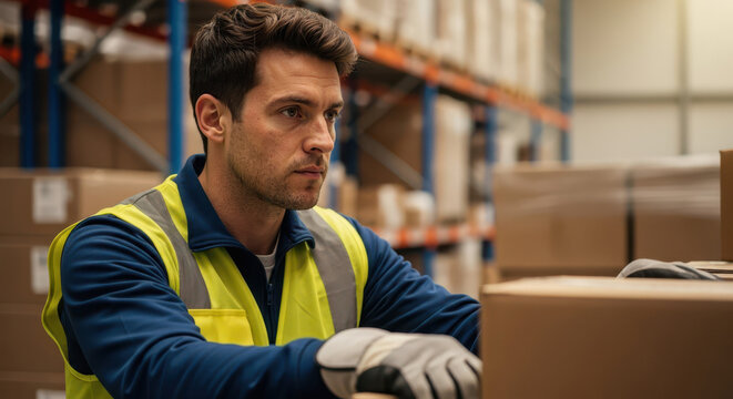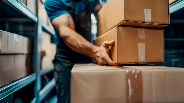 Trabajador de almacén cargando caja de cartón durante su jornada laboral, póster horizontal