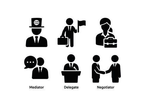 flat black solid icon items isolated on white background diplomat (roles): ambassador envoy attache mediator delegate negotiator