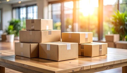 Cajas de cartón apiladas en oficina moderna iluminada por el sol, concepto de paquetería, logística y comercio electrónico