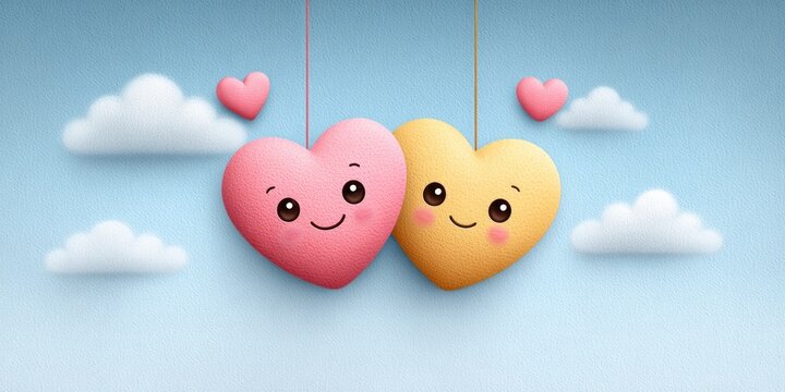 a soft watercolor illustration of heart and smile emojis floating in the sky with clouds