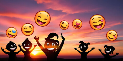 Silhouette of children with raised hands and floating emojis against a sunset sky background view