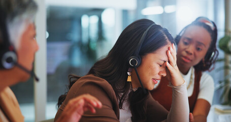 Business people, women and mistake with telemarketing, anxiety and error with startup failure, burnout and deadline. Group, agent and staff with pc, sad and emotion with support, pressure or bad news