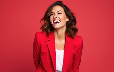 Happy ultra beauty business girl, who is smiling and laughing, wearing bright clothes. Bright solid background. created by generative AI technology.