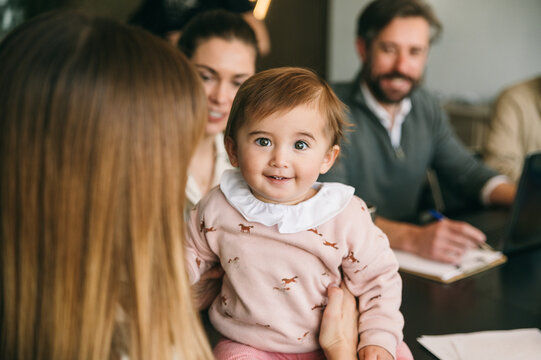 Family moment with a happy baby in business meeting