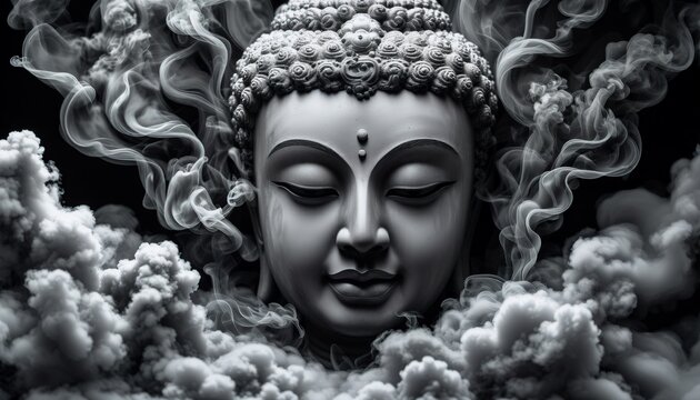 swirling clouds of smoke morph into a compassionate buddha head, its kind eyes radiating serenity, the stark black backdrop amplifying the image's emotional impact.