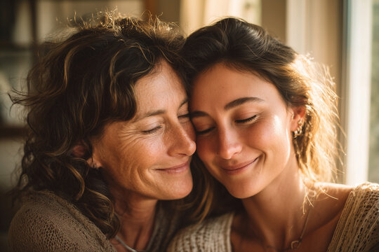 Tender mother and daughter close embrace in warm golden light — genuine family bond, peaceful smiles and intimate emotional connection at home.
