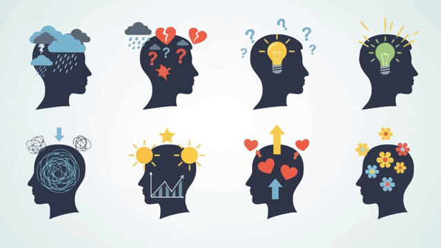 Collection of eight silhouette heads illustrating various emotional states and thought processes, from sadness and confusion to creativity and happiness.
