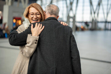 A couple shares a warm hug at a snowy train station, capturing a moment of love and togetherness amidst the cold environment and holiday atmosphere.