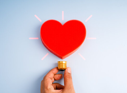 Creative love concept with red heart shaped lightbulb held by hand on pastel blue background, symbolizing romantic idea, social media trend, content inspiration, passion, and emotional connection.