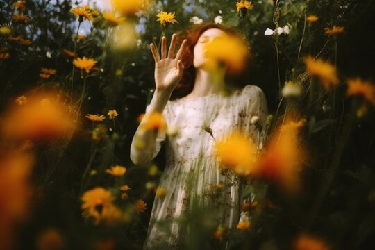 Sad woman behind foggy glass holding a bouquet of roses, grey background, slightly wilted petals, still life photo.