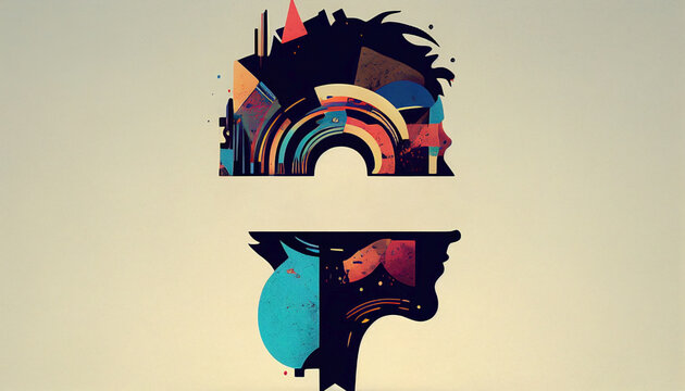 Ai generated. Copy space for brand name.Minimalist design for a psychologist and psychiatrist cabinet. Silhouette of a person's head in profile. Dark background with colorful patterns.