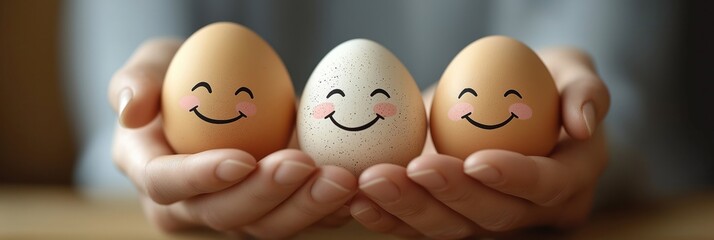 Hands hold three smiling eggs. Positive feelings, teamwork concept. Goodwill, happiness presented in graphic design. Image perfect for business, education, easter themes. People use to show support,