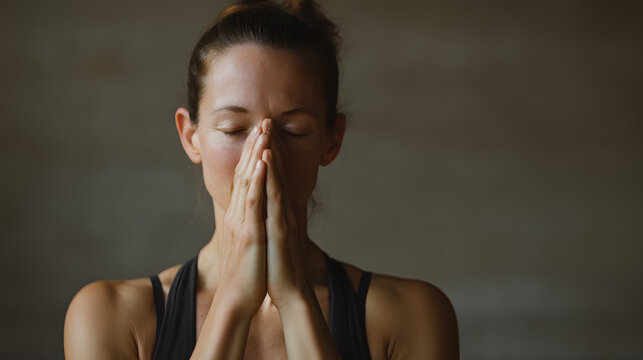 Woman experiences emotional release during yoga, covering her face with hand. Honest depiction of vulnerability, stress relief, and self-connection through movement.