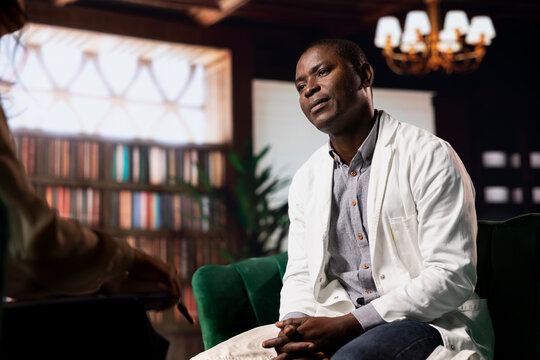 African american doctor sharing his bad experience with patients, opening up about ptsd with empathetic therapist. Woman expert providing support for depression and anxiety, wellbeing.